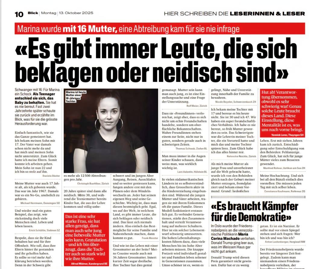 Respect for keeping her child and for her openness. How great that her parents stood behind her and helped her. There should be so much more education. Because in Switzerland there are more than 12’500 abortions per year. Christoph Buettiker, Zürich